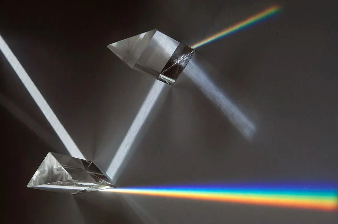 "With a deep appreciation for photography, I have always been fascinated by optical phenomena. One of the classics is the diffraction of white light through a prism. The pure form of the prism became the starting point for this formal exploration. Here, the elongated prism is set in tension with pitched surfaces. Warm light appears suspended within the prism, as if the optical experiment itself had been paused mid-motion. »