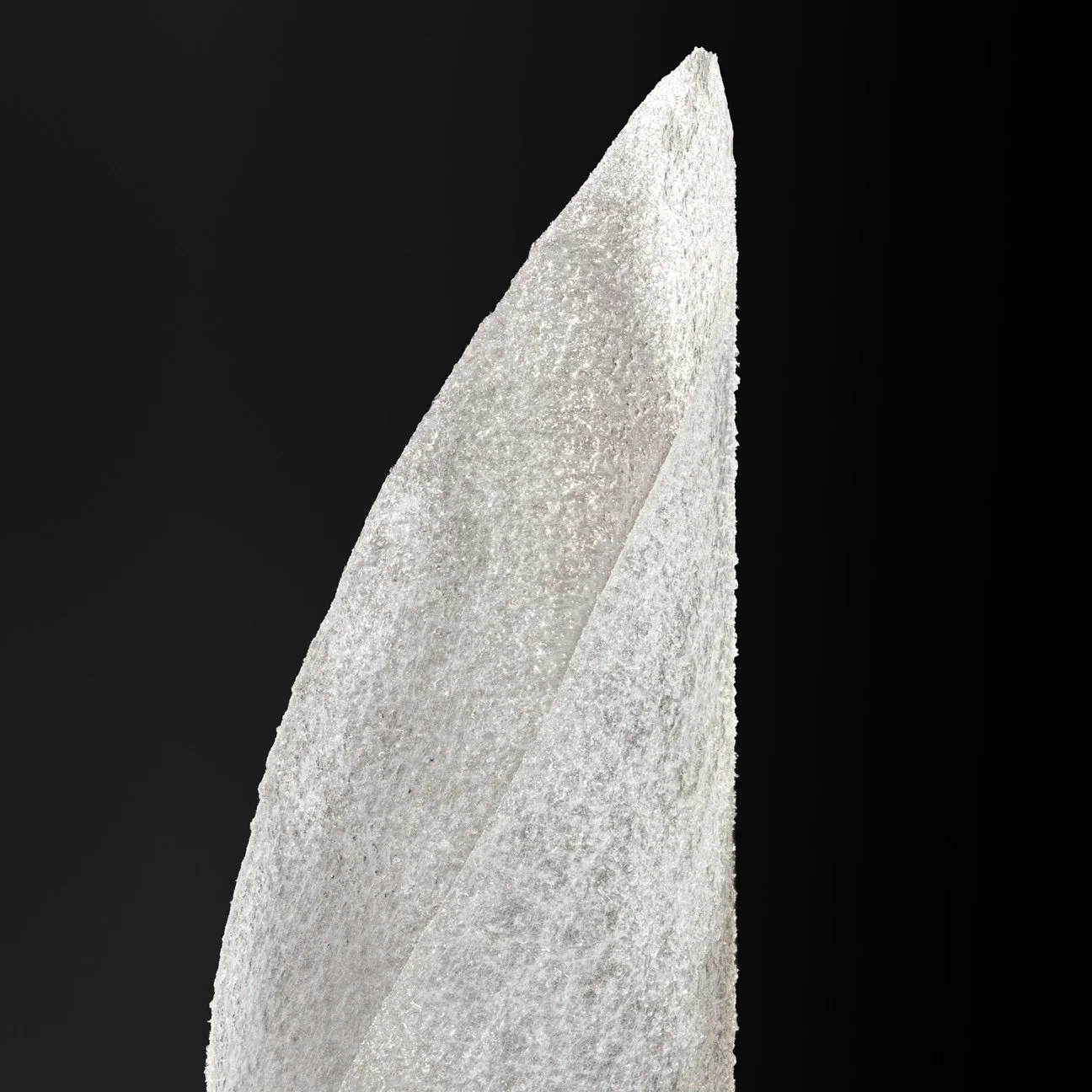 Unsatisfied with the limitations of traditional blown glass or crystal, as well as fiberglass, Hadrien developed this new material from a specific industrial silk. Thanks to hours of alchemy, the soft white fabric becomes hard and transparent — this is crystallization. Thinner than one millimeter, Silk Crystal has a textured surface that looks frozen. Natural or electric light passes through it magically.